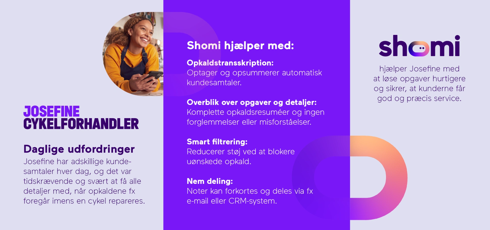 Shomi kan tage imod opkald på dine vegne, analysere samtaler, generere transskriptioner og resumeer, fremhæve vigtige pointer samt levere tekster til nem deling – så du kan bruge langt mindre tid på manuel opfølgning efter både opkald og møder.