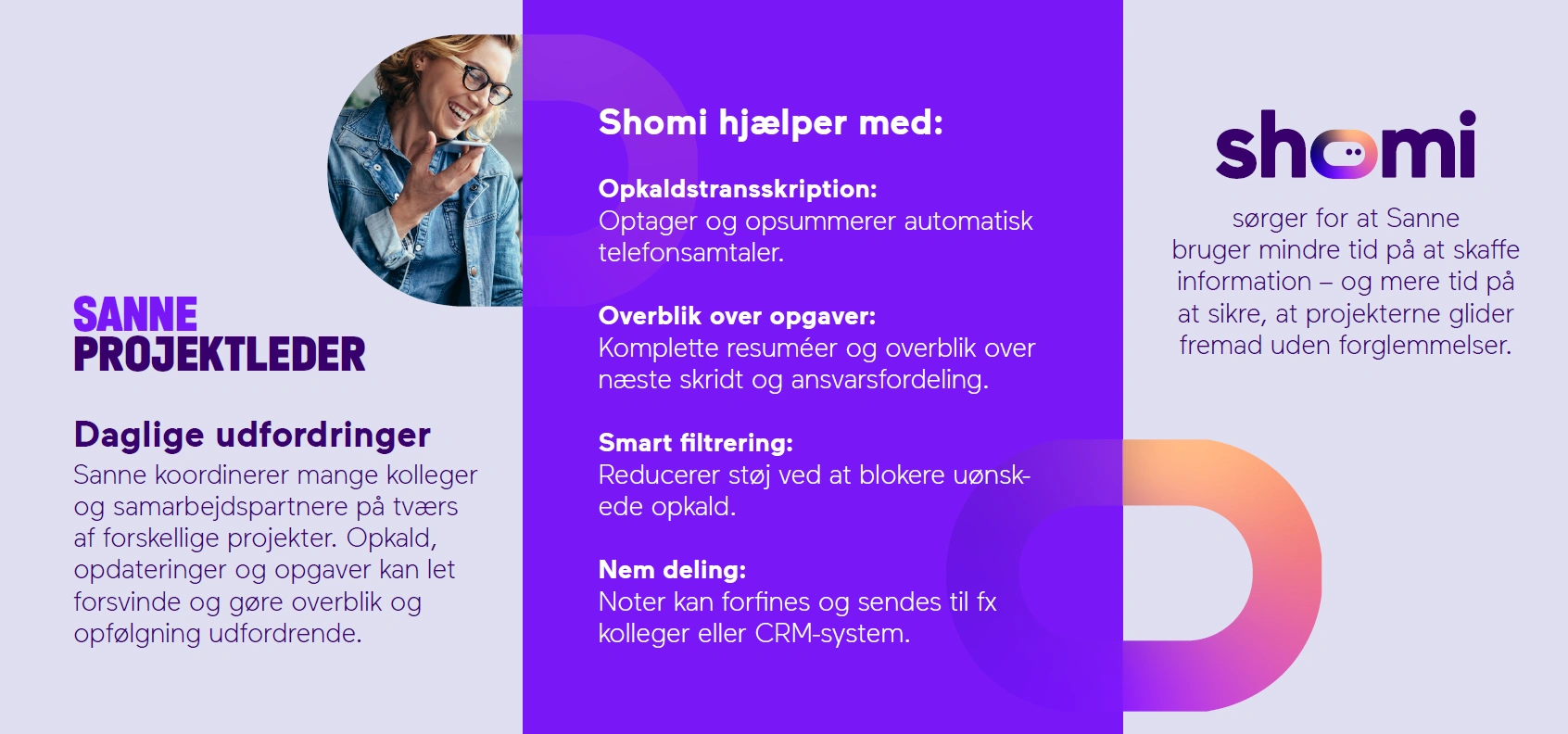 Shomi hjælper dig med at håndtere opkald, møder og telefonsvarer med intelligent automatisering – så du kan prioritere din tid uden at gå glip af vigtig information.