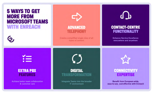 Enreach has identified some tangible ways customers can enhance Teams as part of a more comprehensive digital workplace. The result is a holistic, single source for IT and communications. Plus, our Teams integration creates a powerful opportunity for telecom and ICT partners to differentiate and expand their own offerings.