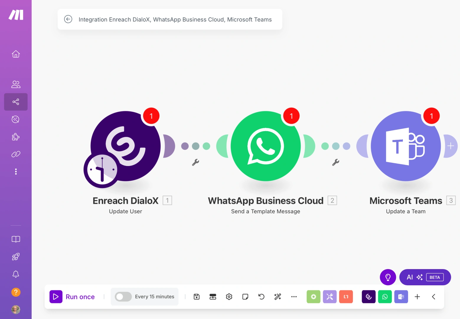 Dialox in a make.com scenario with WhatsApp message and MS Teams update.